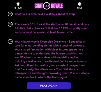 You get dropped in a chat and the game just screams choices at you: "Movies or Music?"—BAM, the wrong people vanish. "Tarantino or Marvel?"—POOF, more idiots gone. It gets deeper and weirder until it's just you and that one other person who agrees that Vincent Vega was the interesting one, not Jules - and that's probably your best bet for a decent conversation today, before you both get weird and disappear forever. You’ve just formed a modern friendship, well done!