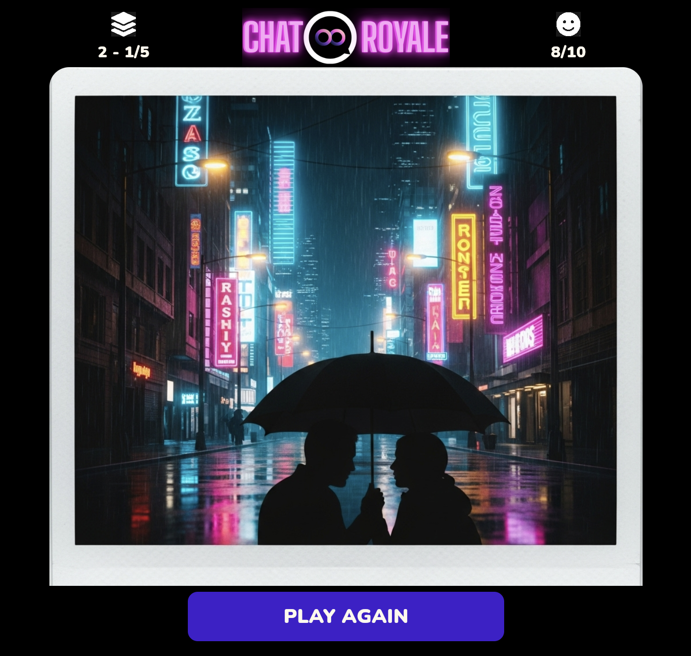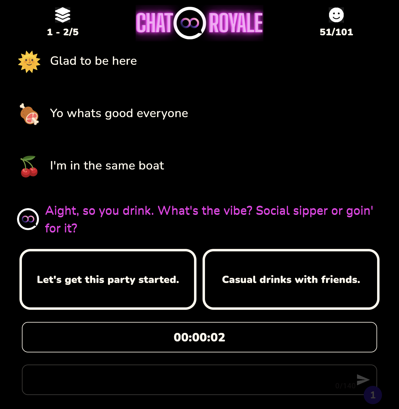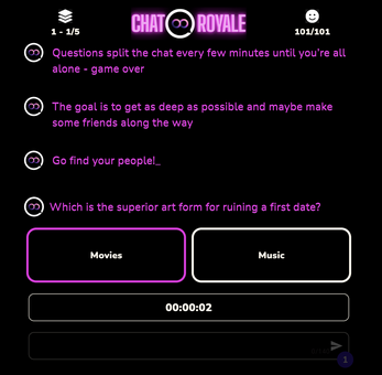 A therapeutic massively multiplayer social discovery & survival game filtering players into ever more intimate chats through an endless combination of tough choices until you and, hopefully, your new friends (or an epic troll) are the last chat standing! Loneliness is the new smoking and Chat Royale is the "cure" - roll the dice: